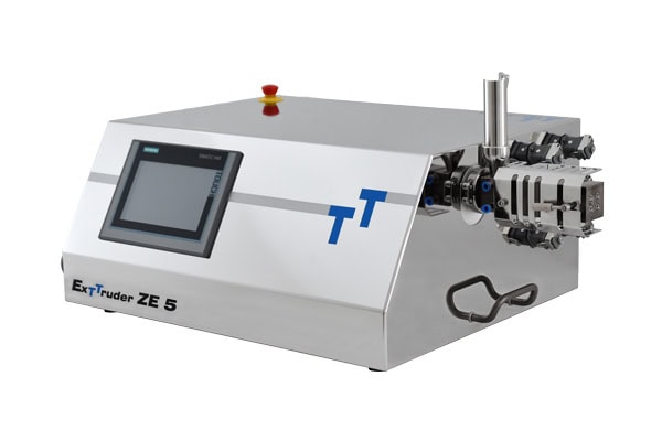 Der Standard Mini Extruder ZE 5 HMI im Table-Top Format ist der vermutlich weltweit kleinste Extruder, welcher mit allen Optionen wie seine grösseren Brüder ausgestattet werden kann.